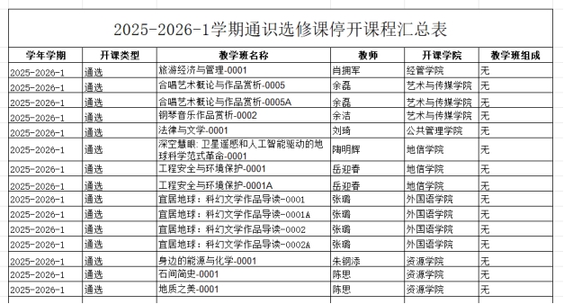 因选课人数未达到开课标准,经开课学院和学生所在学院决议,2025年秋季学期以下通识选修课停开。请同学们根据需要在补退选阶段选择其他课程。