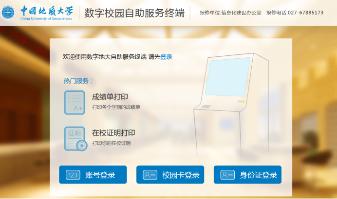 自助服务终端提供了三种登录方式:账号登录、校园卡登录和身份证登录。用户可以通过输入账号/密码登录、刷校园卡登录或者刷身份证登录。