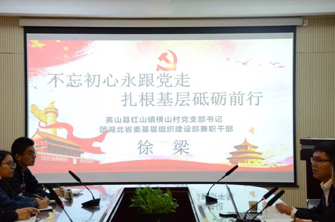 (通讯员:杨昊、陈豆、任颖博、姚文昊)2019年11月13日晚7点,湖北省五四青年奖章获得者、优秀大学生村官代表、英山县横山村党支部书记徐梁,走进工程学院,参加了学院“不忘初心,牢记使命”主题教育活动。2019级硕士研究生勘基系党支部、实验班本科生党支部党员和学院“筑魂班”部分学员参加活动。