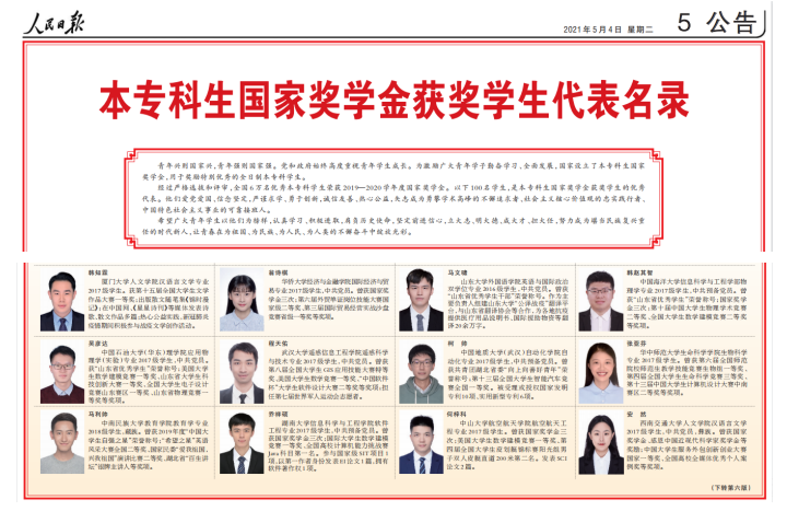 5月4日,人民日报刊发了2019-2020学年度本专科生国家奖学金获奖学生代表名录。经过严格选拔和评审,全国6万名优秀本专科学生荣获2019-2020学年度国家奖学金,100名学生入选本专科生国家奖学金获奖学生代表名录。bevictor伟德官网柯帅名列其中,是bevictor伟德官网唯一获此殊荣的在校生。