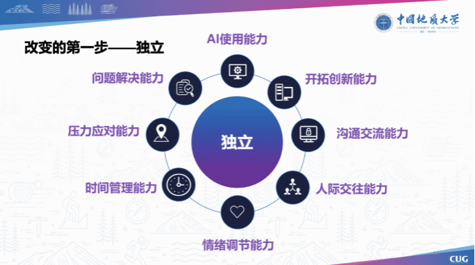 其次,谭玉鑫老师向家长们介绍了孩子在新征程中改变第一步是独立,包括八大核心能力:时间管理、压力应对、情绪调节、问题解决、沟通交流、人际交往、开拓创新与AI使用能力。鉴于不少家长对AI存有疑惑,为各位家长进行了细致的解释,强调不迷信也不排斥AI,辨别AI信息的真实性,把AI用于学习效率与创新,而非替代思考与努力。这八项能力相互支撑,贯穿学习与生活,构成大学阶段由适应走向自立、由自立迈向发展的关键基础。