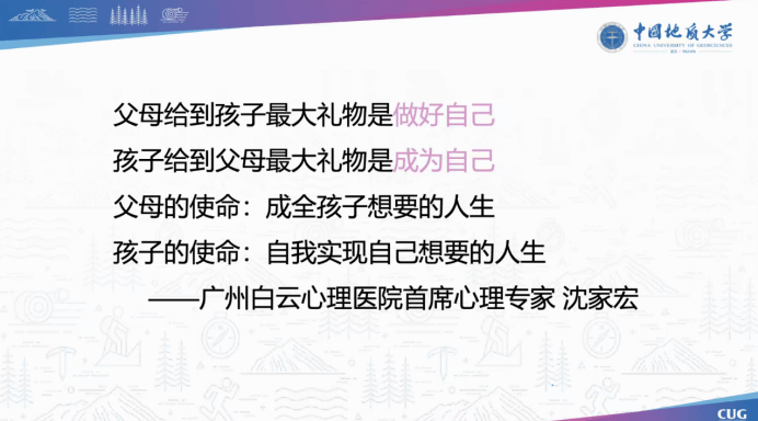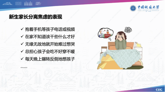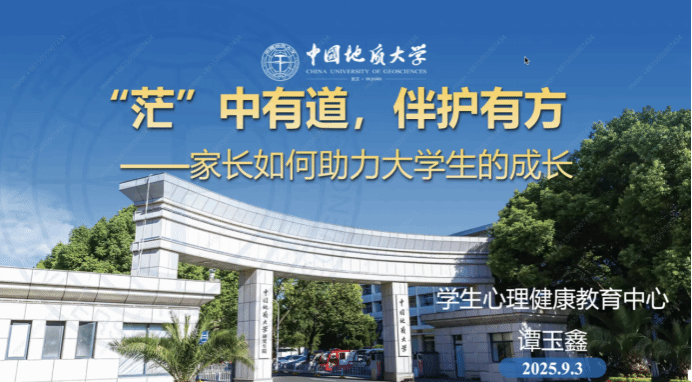 随着新学期的开启,孩子们完成从中学生到大学生这一重要身份的转变。面对生活与学习环境的变化,部分学生在过渡期难免遭遇一系列心理健康方面的挑战与困扰。为了深化家长在孩子大学成长旅程中的参与感与关注度,并进一步强化家校合作机制在心理健康教育领域的协同效应,中国地质大学(武汉)学生心理健康教育中心邀请谭玉鑫老师于2025年9月3日晚18:30开展线上讲座,为家长带来一场专业而通俗的心理健康教育知识科普讲座。