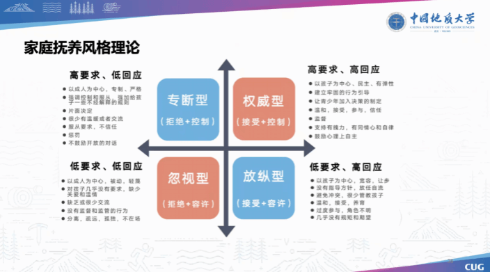 再次,谭玉鑫老师通过家长的教养方式与大学生成长的相关研究结果,说明教养方式对大学生八大核心能力发展的影响,强调积极的教养方式和父母的情感温暖对孩子成长具有重要意义和作用。谭老师还向各位家长介绍了家庭抚养风格理论,将父母的抚养风格分为四种:专断型(拒绝+控制)、权威型(接受+控制)、忽视型(拒绝+容许)、放纵型(接受+容许),生动形象地讲述了每一种类型的特征,并让家长反思自己是哪一种类型。
