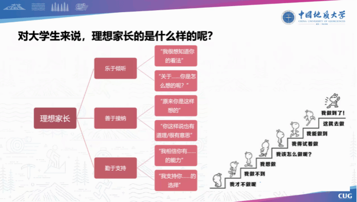 谭玉鑫老师在最后分享了在大学生的心中理想家长应具备三点:乐于倾听(先问想法,再给建议)、善于接纳(看见并理解差异)、勤于支持(给资源与鼓励,而非替代与指令)。同时,也为家长们如何发展孩子们的八大核心能力提供了建议,如学会适当放手、引导压力管理、指导制定计划、启发换位思考……让家庭成为能力练习场,和学校一道,陪伴孩子从适应走向自立、从自立迈向发展。鼓励父母要做好自己,孩子也要成为自己。