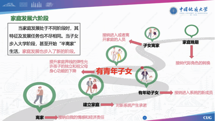 谭玉鑫老师首先从家长所面临的挑战入手,提示孩子迈入大学,家庭进入新阶段,学习生活更自主、同伴来源更广,部分家长可能出现分离焦虑。倡议家长完成角色转变:从管理者走向引导者、从包办者走向支持者——尊重成长边界,少替代多赋能;鼓励孩子自理、自护与独立决策,共同迈过“分离”的必修课。