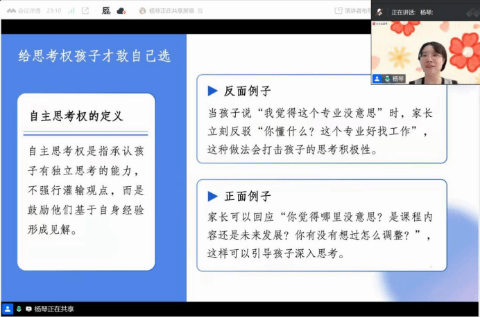 讲座核心部分,杨琴老师为家长们提供了 “支持而非掌控” 的行动指南。她强调,家长需先完成从 “主导者” 到 “支持者” 的角色转变:在 “退位” 中归还孩子选择权,如让孩子自主规划学业、处理生活小事。同时,她特别提醒家长避开 “甩锅式退位”“放任式试错”“急于求成” 三大误区,保持 “慢慢放手、始终在场” 的耐心。