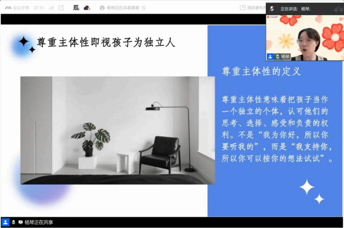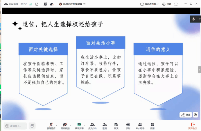 在 “父母爱的误区” 环节,杨琴老师通过对比家长 “替孩子订票收拾行李”“干涉职业选择” 等惯性行为,与孩子 “依赖迷茫”“自我怀疑” 的反应,指出:“真正的爱不是替孩子避坑,而是陪孩子学会走路。” 她从哲学与教育学视角,深入阐释 “尊重主体性” 的内涵 —— 将孩子视为独立个体,认可其自主思考、选择、感受与承担责任的权利,而非 “家长的附属品”,并从 “给思考权”“给选择权”“接纳情绪”“拒绝比较”“归还后果” 五个维度,给出具体可操作的尊重方法。