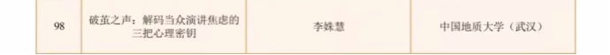 作品《破茧之声:解码当众演讲焦虑的三把心理密钥》,精准聚焦大学生当众演讲焦虑这一共性成长困扰。从心理学专业视角切入,系统拆解了演讲焦虑的成因,提炼出可落地、易操作的心理调适方法,为有表达困扰的同学提供了科学的心理指引。该作品既体现了李姝慧老师对大学生心理成长需求的精准洞察,也展现了高校教师在心理健康教育科普与实践创新方面的深厚积淀。其内容兼具理论深度与实用性,既帮助个体化解演讲焦虑、突破心理壁垒,也为高校开展表达能力培养、心理赋能教育提供了优质参考范本。