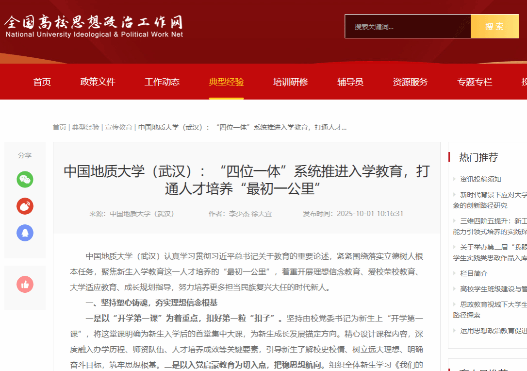 (通讯员 徐天宜)10月1日,全国高校思想政治工作网“典型经验—宣传教育”专栏刊发《中国地质大学(武汉):“四位一体”系统推进入学教育,打通人才培养“最初一公里”》一文,专题介绍bevictor伟德官网新生入学教育的创新实践、经验做法与工作成效。现将全文转载如下: